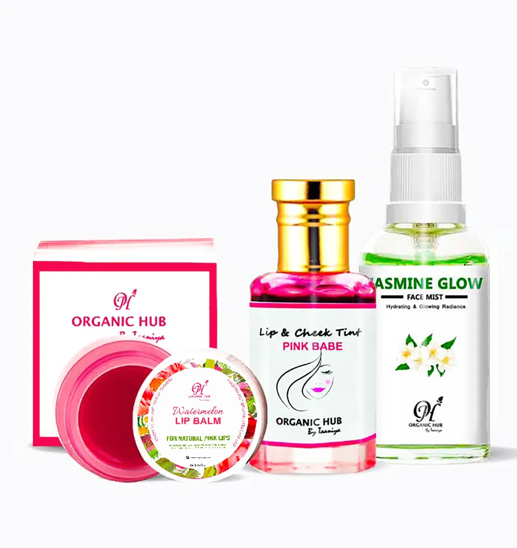 Buy Best Organic Lip Care Products in Pakistan. Shop Natural and Organic Lip Care products at Organic Hub by Taaniya. Find unrivalled Lip Balms, Lip Cheek Tints, Lip Scrub and Lip masks from the Top Organic Skincare Brand in Pakistan. Our amazing Lip care products work on dry, chapped and damaged lips and leave them soft and hydrated. The deal includes Bestseller Organic Lip and Cheek Tint Pink Babe, Tinted Lip Balm Watermelon and jasmine Infused Dewey Glow Mist. Our all Natural and Organic Lip care products help in transforming dark lips into natural pink and soft lips. You can Buy the Best Organic Lip Care online now!